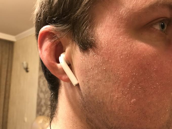 Сразу хочу сказать, что в ушах они сидят прекрасно. Я это проверил не только на себе, но и на жене. Видимо мы относимся к тем людям, которые имеют среднестатическую форму ушей. Во время ходьбы, бега и просто использования дома, наушники ни разу не выпадали из ушей. Первые несколько дней был небольшой дискомфорт от отсутствия проводов, но он быстро прошёл. На каждом наушнике находится по два оптических датчика, благодаря которым AirPods «понимают» в ухе они или нет. В нижней части каждого наушника находится отверстие для микрофона, закрытое сеткой. Вокруг него — металлическое кольцо, состоящее из двух сегментов. Это контакты, через которые наушники заряжаются в кейсе.