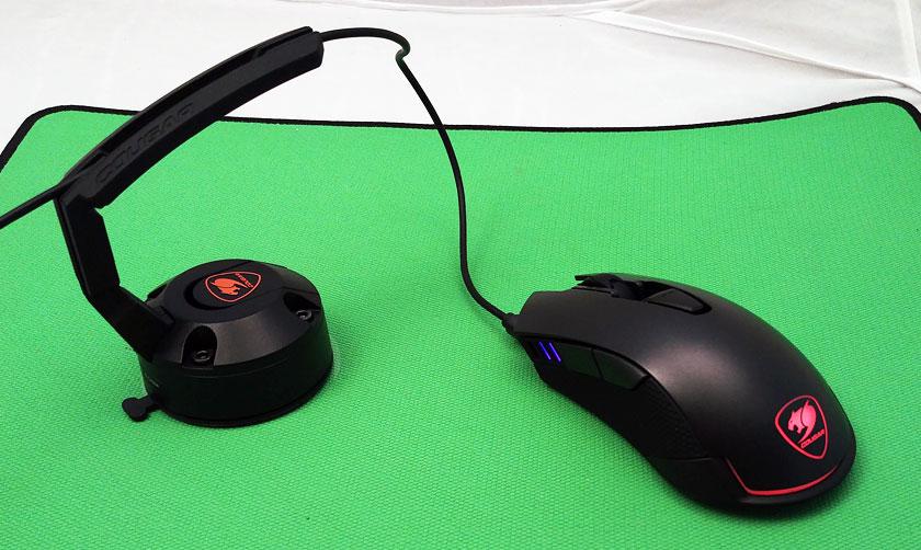 Cougar Revenger имеет все предпосылки быть крайне интересной геймерской мышкой: проверенный, отличный оптический сенсор PixArt PMW3360 с максимальным разрешением 12 000 DPI, микропереключатели Omron на 5 млн нажатий (не топовые, но качественные), 32-битный ARM процессор, 512 КБ встроенной памяти для сохранения профилей и настроек, программируемые кнопки, частота опроса 1000 Гц и приятный бонус в виде RGB-подсветки. Посмотрим, как это всё вместе работает. Держатель для кабеля Cougar Bunker интересен своей конструкцией, в особенности — очень мощной вакуумной присоской, которая намертво крепит его к столу, ближе к концу обзора мы более детально рассмотрим сей чудный аксессуар.