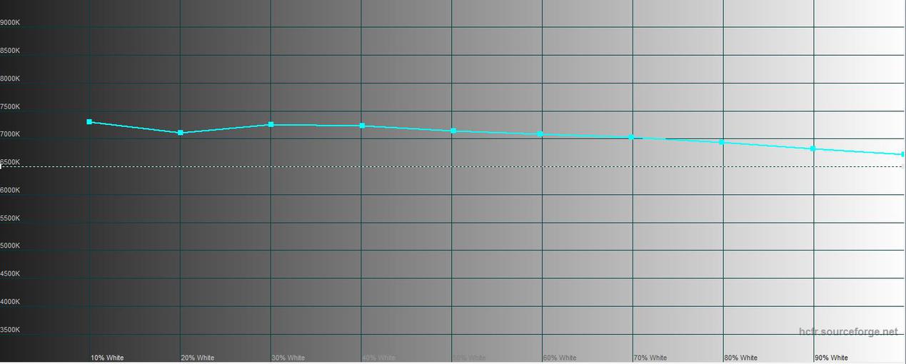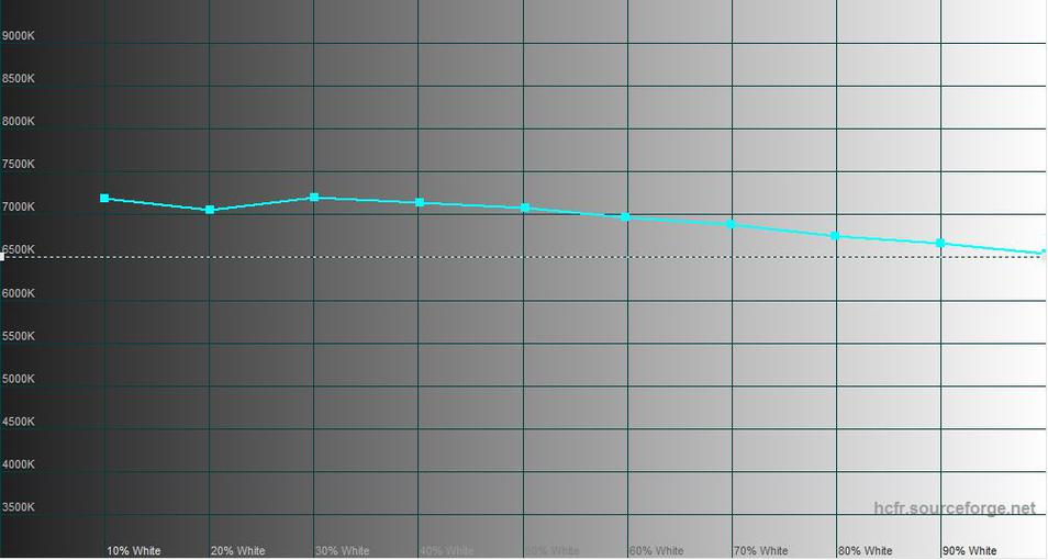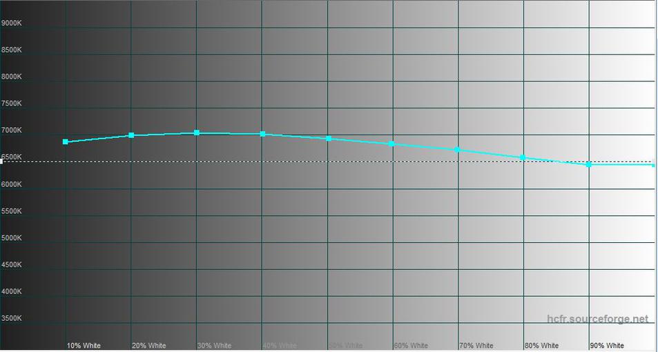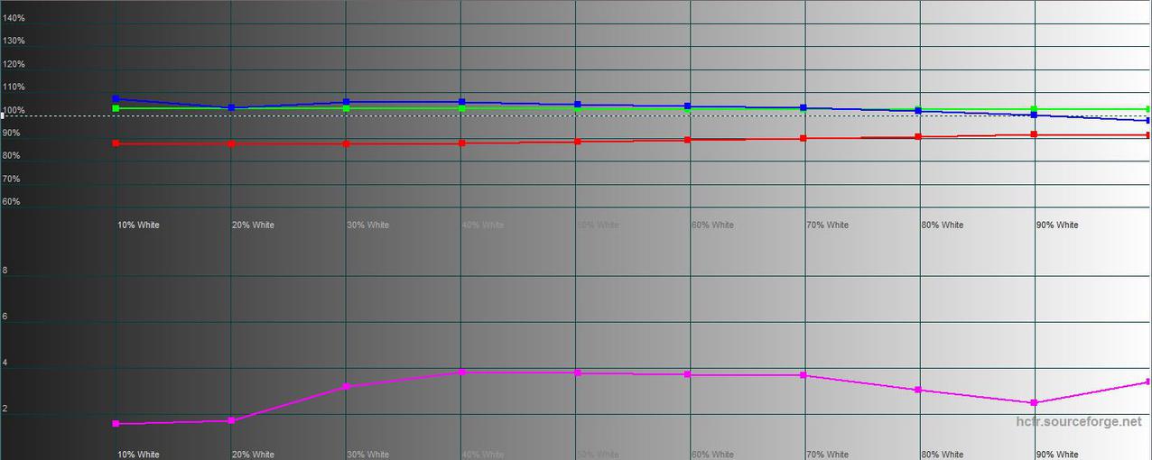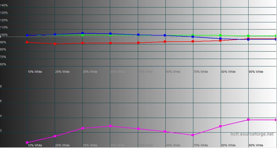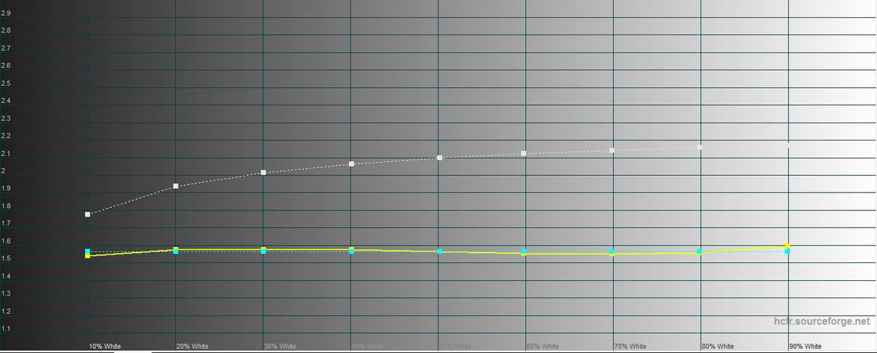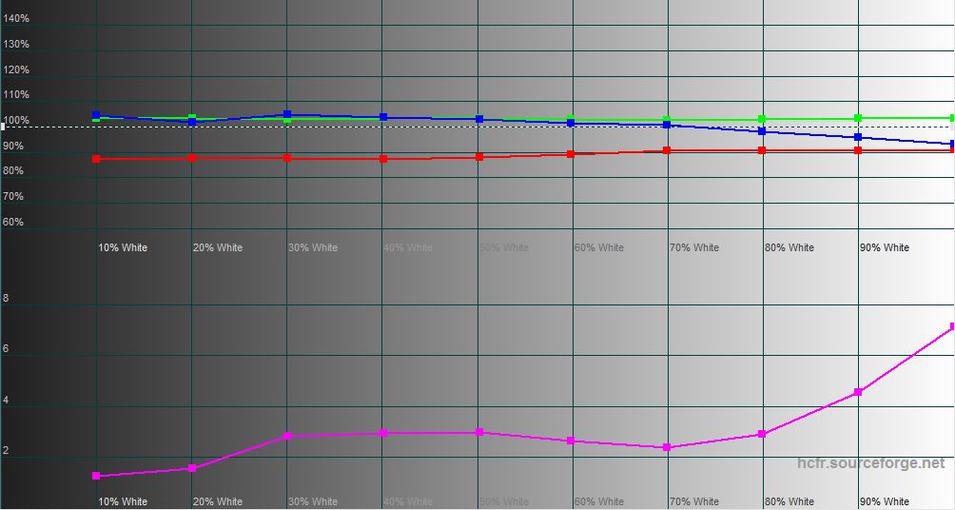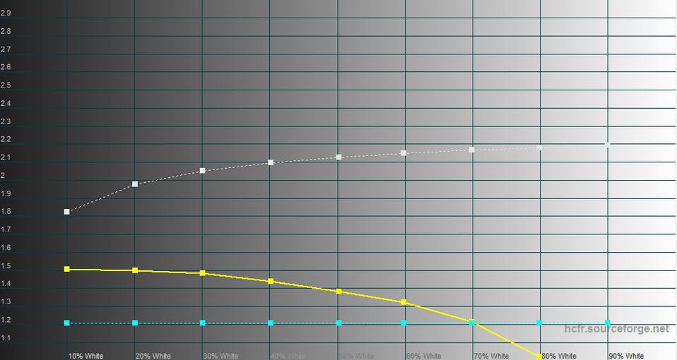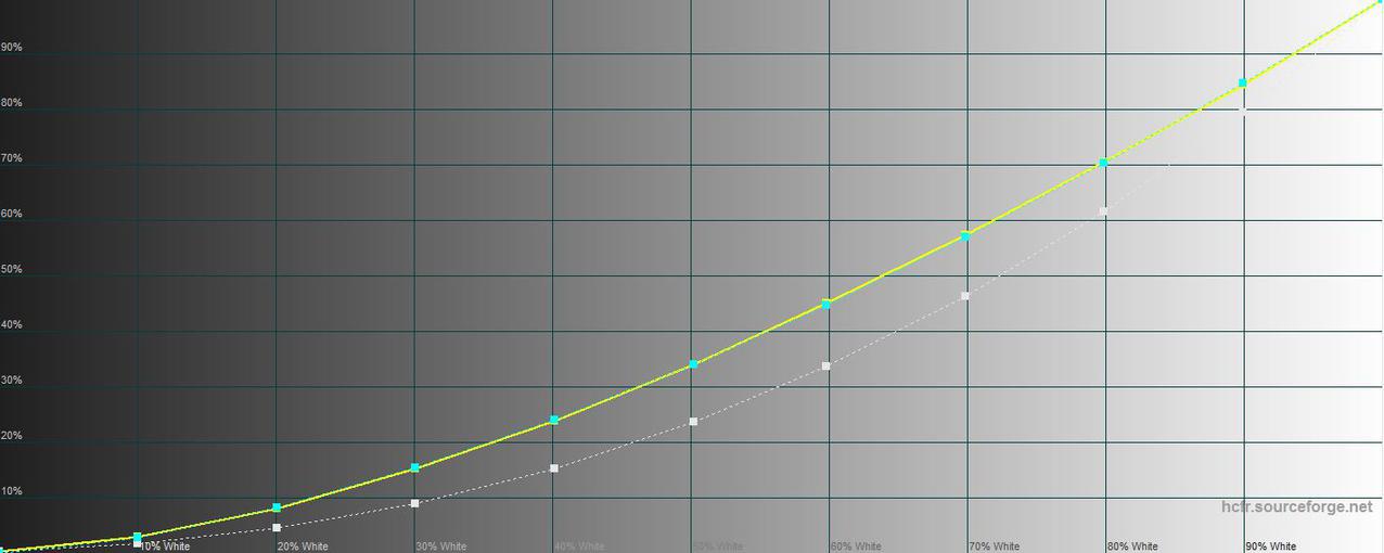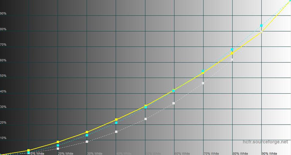 В режиме "фото" максимальная яркость ощутимо ниже 288.269 кд/м2, минимальная — 0.924 кд/м2, а показатель контрастности — 312:1. В целом, графики схожи, но гамма-кривая не настолько радикально отличается от эталонной: