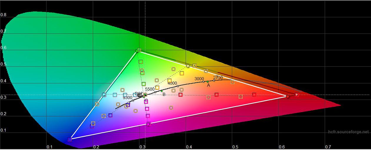 Мы измерили показатели яркости и цветопередачи монитора в разных режимах. В пользовательском режиме показал максимальную яркость даже больше заявленной: 368.337 кд/м2, минимальная — 0.915 кд/м2, а показатель контрастности невысок (опять же специфика TN-матриц как таковых) 403:1. На графиках видно, что гамма-кривая далеко не совпадает от эталонных показателей, так что искажений не избежать. Заводская калибровка очень порадовала, красная, синяя и зеленая составляющие очень близки к эталону, цветовая температура изменяется в пределах от эталонной 6500K до 7000K, а погрешность ΔE не превышает показатель 4. На CIE-диаграмме видно, что цветовой охват очень близок к эталонному sRGB:
