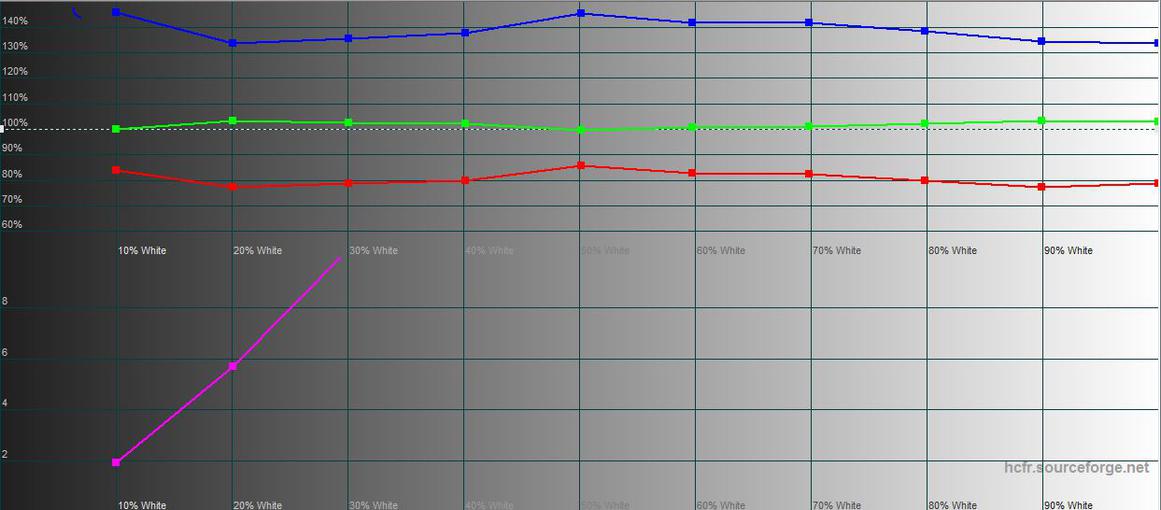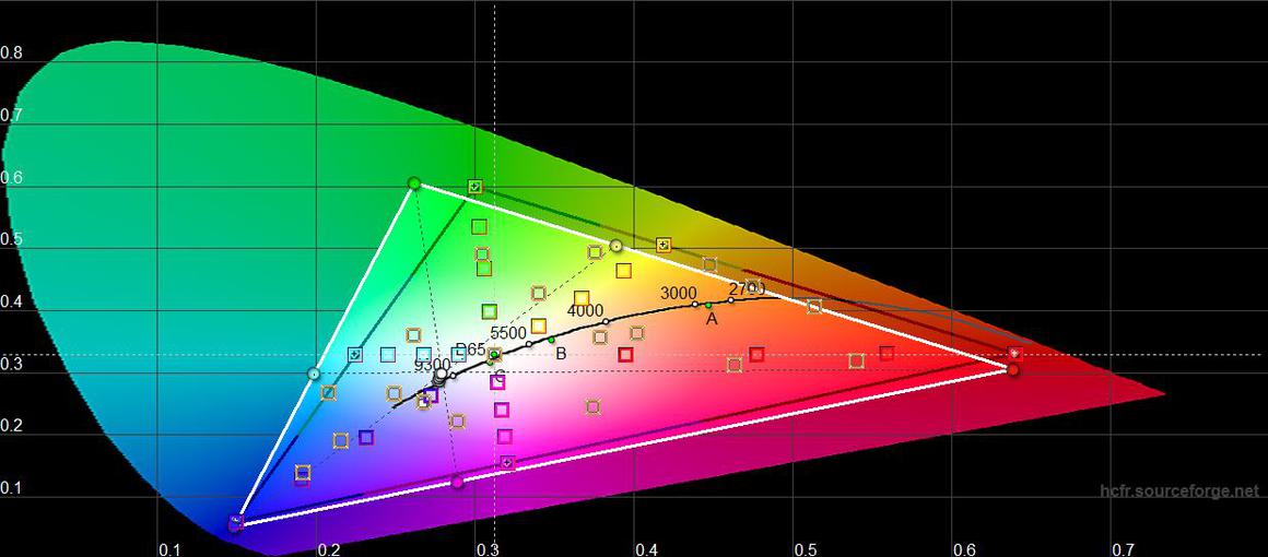 Замеры колориметром показали, что максимальная яркость составляет далеко не рекордные для IPS-экранов 358.716 кд/м2, хотя на ярком солнце с читаемостью все в полном порядке. Яркость черного поля — 0.229 кд/м2 и высокий показатель контрастности — 1566:1. Возможно вопрос конкретного сэмпла, а возможно и сознательное решение, дабы снизить минимальную яркость, а соответственно и энергопотребление при включенном Always-on Display. Калибровка не лучшая: существенный перебор синего и недостаток красного. Картинка холодная, опять же, возможно особенность инженерного образца: