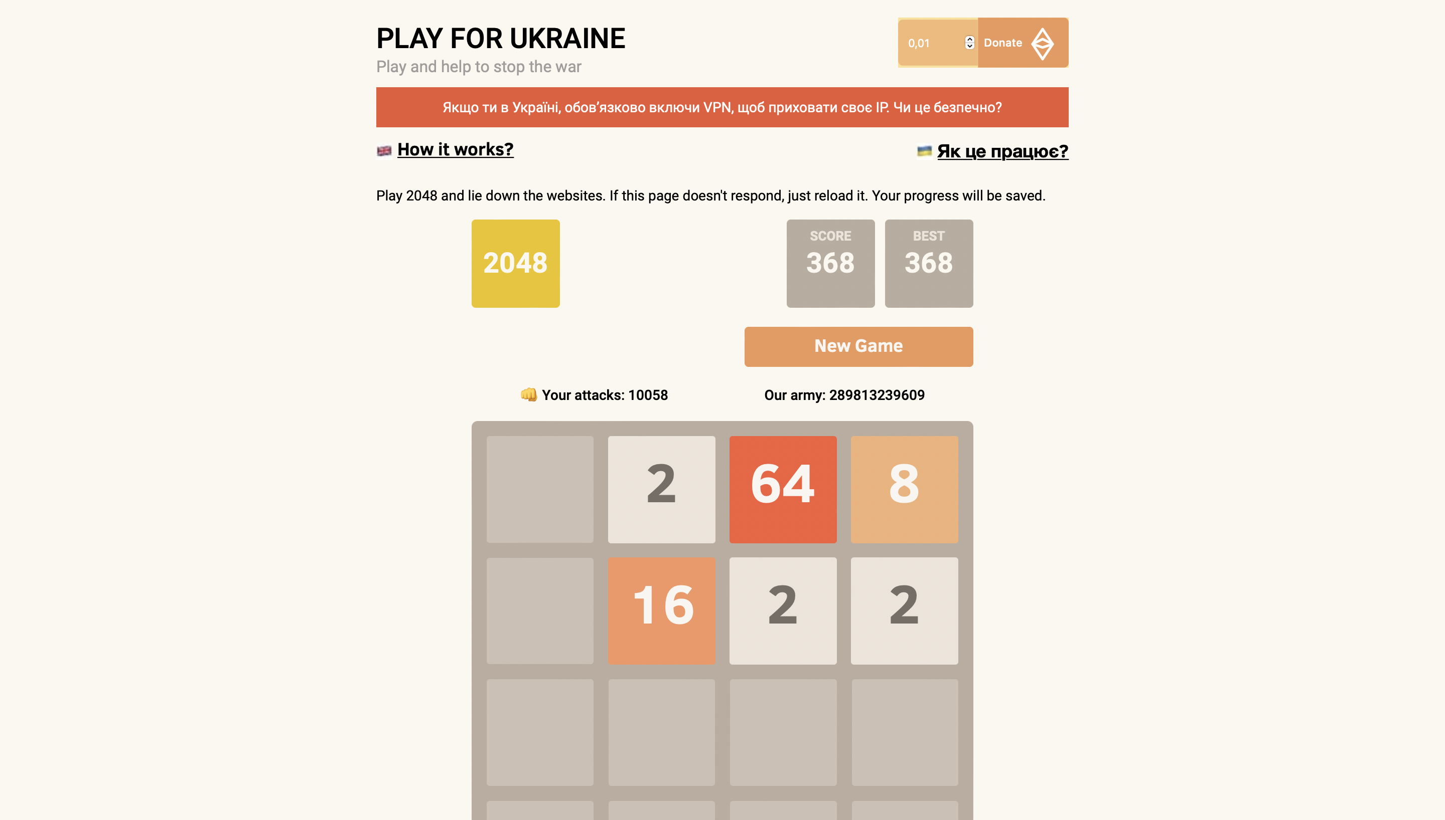 Сайт представляет из себя популярную игру 2048. Один игрок за один час посылает 20 000 запросов для блокировки сайтов, которые обслуживают армию России. По словам разработчиков, с момента запуска сайта удалось уже привлечь 180 000 игроков и «положить» около 200 сайтов.