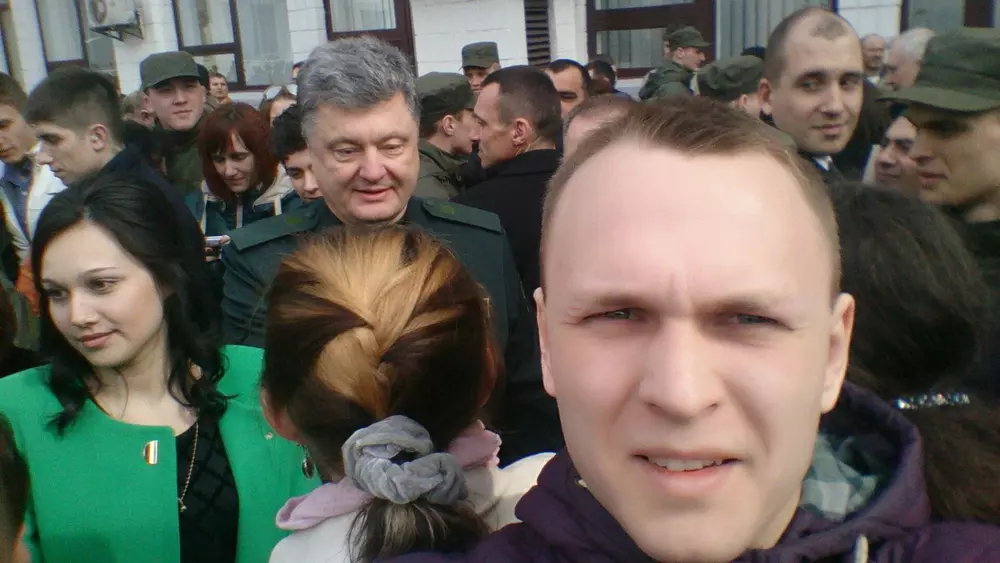 За спиной на мониторе знаменитое фото, сделанное 08 декабря 2013 года на Майдане Незалежності. По разным оценкам в тот день выразить свою гражданскую позицию пришло от 400 000 до 1 000 000 человек.