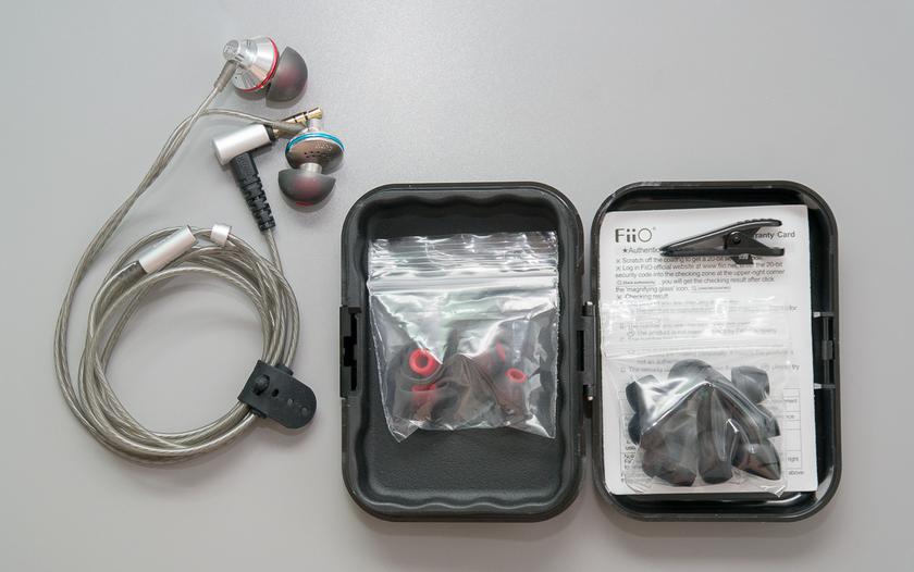 Fiio EX1 поставляются в пластиковом блистере. В комплект входит компактный жёсткий кейс для переноски, съёмная клипса для крепления кабеля на одежду и большое количество насадок разных размеров.