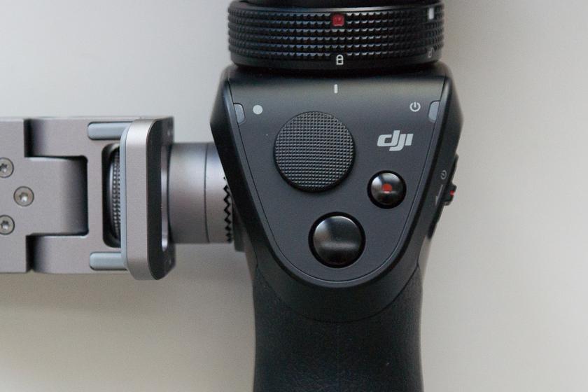 Основные органы управления у DJI Osmo расположены прямо на рукояти. Это в первую очередь аналоговый стик, предназначенный для управления движением камеры, кнопка старта/остановки записи видео и кнопка фотосъёмки. Сбоку расположен ползунок питания.