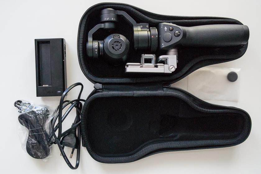 Osmo поставляется в комплекте с жёстким чехлом, напоминающим чехол для миниатюрной скрипки. Кроме чехла, в комплект входит аккумулятор и зарядное устройство. На объектив сразу же накручен защитный фильтр и надета резиновая крышка.