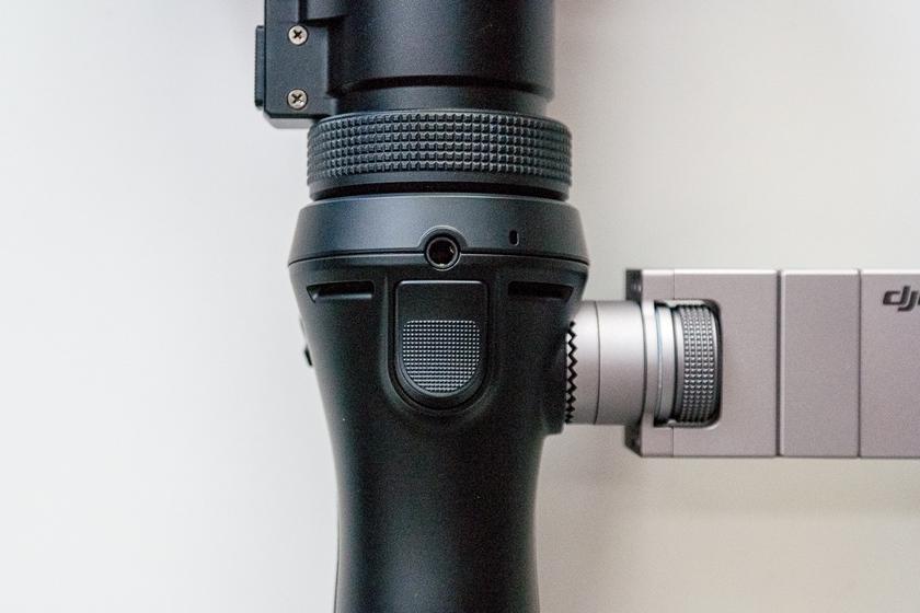 Спереди мы видим вход для внешнего микрофона и курок, который выполняет две функции. Во-первых, если нажать на него три раза, то он развернёт камеру объективом к человеку, который держит камеру в руке — это селфи-режим. Ну а если нажать и удерживать курок, то подвес перейдёт в режим «суперстабилизации» и будет стараться удерживать камеру неподвижно независимо от движений вашей руки. Выглядит это весьма эффектно: