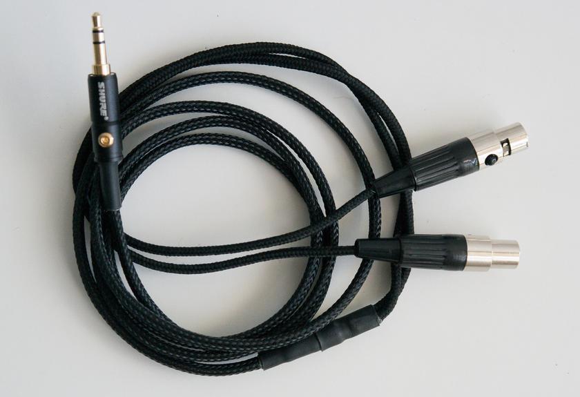 Двухсторонний кабель длиной 1.3м подключается к чашкам при помощи 4-контактных разъёмов мини-XLR, для пущей надёжности оснащённых защёлками.