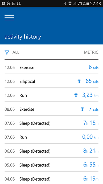В приложении на смартфоне также можно посмотреть список активностей за день: когда ходили, спали, бегали и т.д. Мне все было интересно найти данные о показаниях гальванического датчика и датчика температуры кожи, но похоже, они никуда не выводятся.