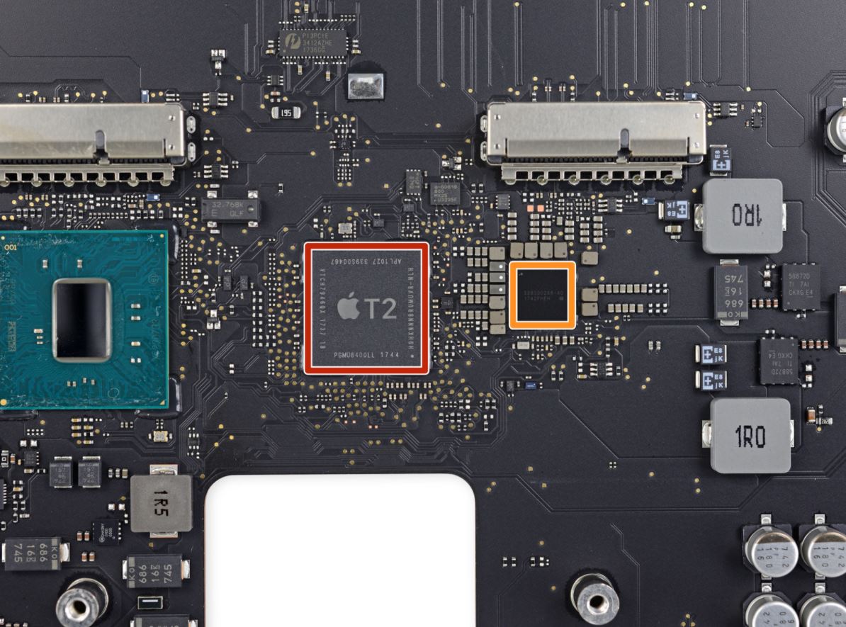 Системная плата содержит видеокарту Vega с 8 гигабайтами памяти HBM2, микросхему Intel X723D733 E1 05780, контроллер AQUANTIA AQtion AQC107-B1-C, два контроллера Intel JHL6540 Thunderbolt 3, контроллер Genesys Logic GL3227A SD 4.0 и ЦАП Cirrus Logic CS42L63. Тут же находится микропроцессор Apple T2. Он отвечает за безопасность моноблока и его систем. Блок питания получил мощность в 500 Вт. По словам специалистов iFixit этого мало для мощного процессора и видеокарты семейства Vega.