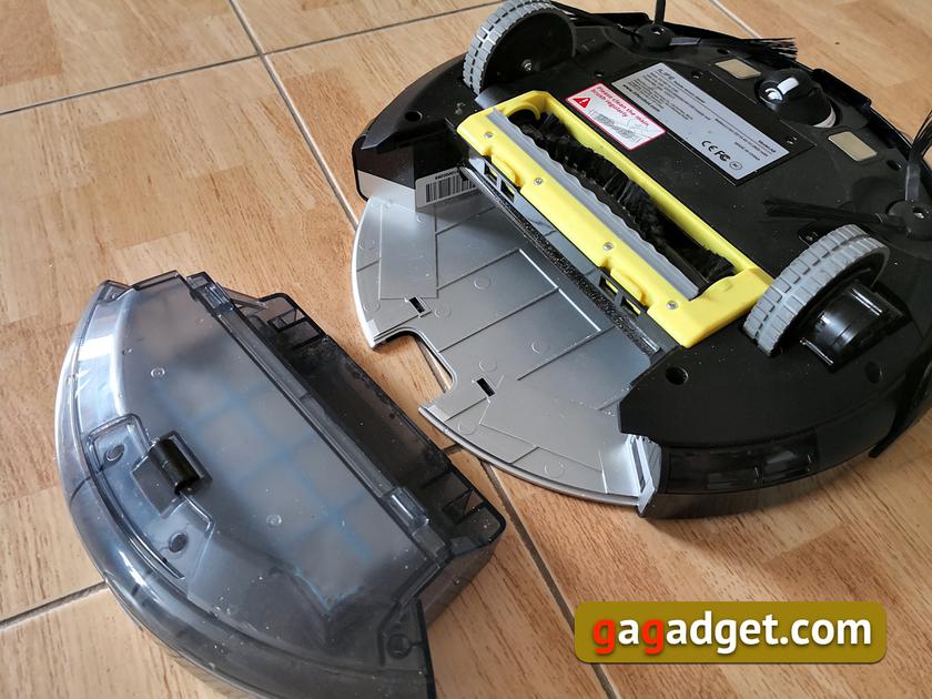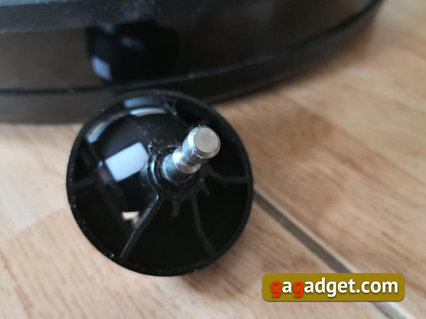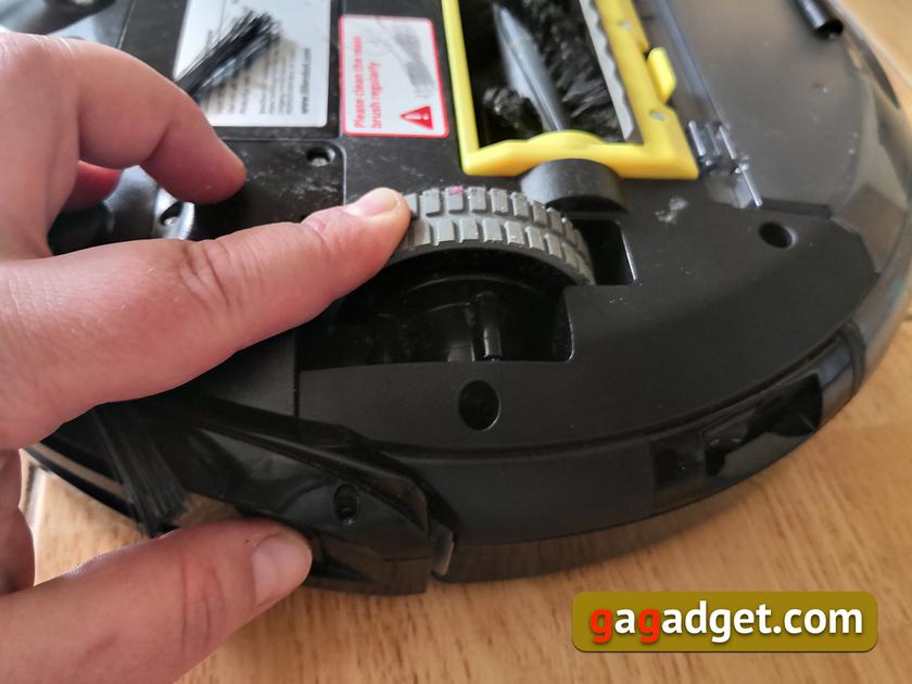 Все довольно просто — съемный контейнер для мусора, две щетки с выступающим за пределы корпуса ворсом (они загоняют мусор к центру пылесоса, где всасываются внутрь контейнера), основная щетка, два больших колеса и съемное поворотное колесико для маневрирования. Слева и справа от колесика размещены контакты зарядной станции. Их нужно время от времени чистить от пыли.