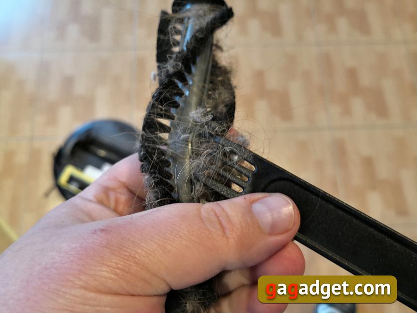Вот так выглядит основная щетка после двух уборок. Чистить ее нужно, практически, после каждой уборки. Для особо брезгливых пользователей в комплект поставки входит специальный инструмент — фактически это просто пластиковая пластинка с щеточкой для пыли на одном конце и 4 зубцами — на другом. Пользоваться ею удобно, но не брезгливые люди (вроде меня) быстрее почистят щетку пальцами. Кстати, примерно за неделю после 3-4 уборок она здорово выскребла и очистила от шерсти коврик в прихожей, где часто любит лежать наша большая кошка породы мейнкун. За что пылесос сразу полюбила моя жена. Производитель говорит, что вторая резиновая щетка лучше подходит для чистки шерсти (зато намного хуже — для чистки ковров). После пары экспериментов я все же остановился на варианте с основной щеткой — я готов заниматься ее чисткой при условии, что пылесос тщательнее убирает всю шерсть по квартире, включая коврики.