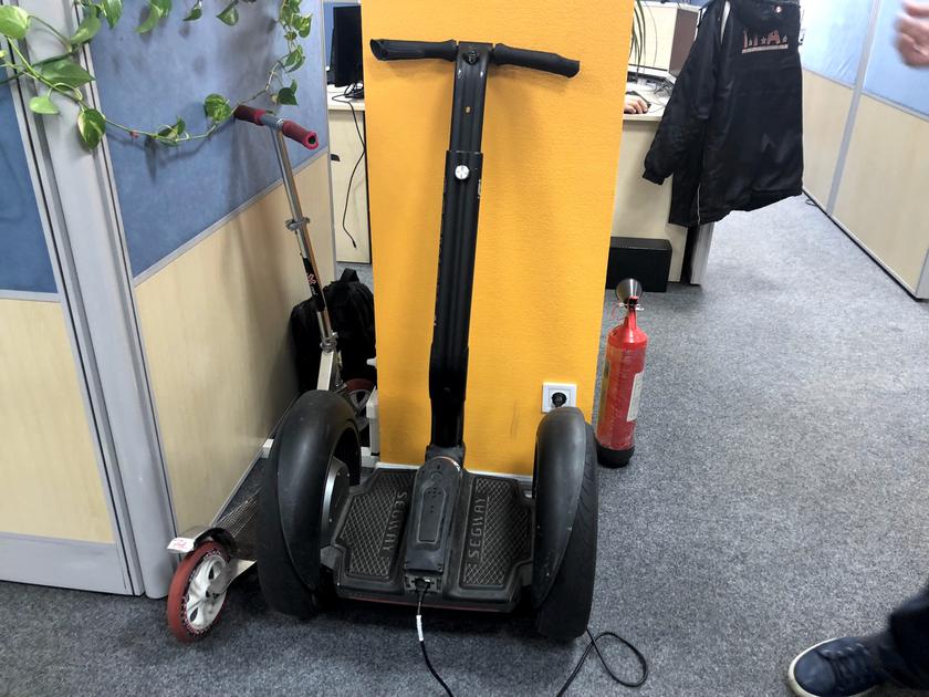 На этом этаже рисунки на полу напоминают дорожную разметку, а у стены стоит сегвей. У него сбиты резиновые накладки на ручках — «от того, что часто сталкивался со стенами», — шутят мои провожатые.
