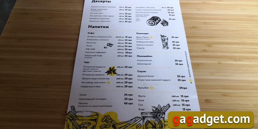 На территории офиса работает кафе с названием Цедра. Из него есть отдельный выход прямо на трибуны стадиона. Иногда это позволяет смотреть какие-то матчи, но для самых важных мероприятий на стадионе, конечно, доступ к трибунам (и, наоборот, с трибун — к офису) закрывается, у них есть свой отдельный вход для зрителей. Меню кафе помещается на двух сторонах листа и тоже демонстрирует творческий подход: