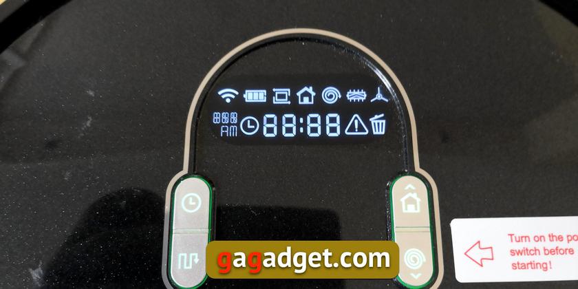 При включении на дисплее отображается полный набор всех иконок. Они помогают понять не только статус пылесоса, но и, например, понять причину остановки работы — переполнен контейнер для мусора, застряла щетка (у меня там несколько раз застревали косточки от абрикос и осколок стекла от разбившейся посуды, который робот исправно нашел под кухонной мебелью). Отдельная иконка отображает статус точки доступа Wi-Fi, необходимой для работы приложения.