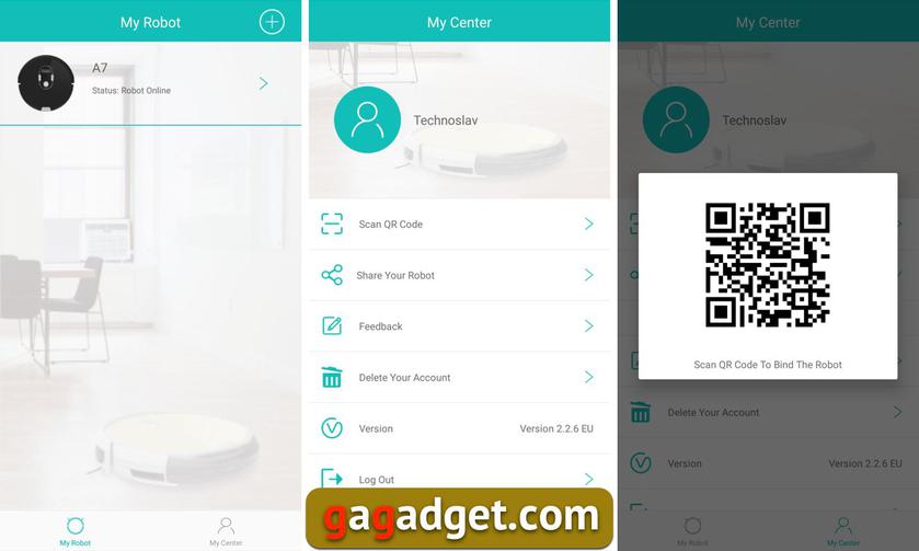Меню приложения простое. Раздел My Center оказался для меня бесполезным — установить связь с роботом на втором смартфоне с помощью сгенерированного QR-кода мне так и не удалось. Точнее я забросил это дело после нескольких неудачных попыток, возможно, стоило пошаманить еще. Но одного смартфона для управления вполне достаточно.