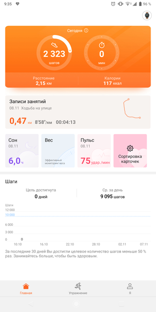 К спортивным функциям моно либо перейти напрямую с помощью нижней кнопки, либо из основного меню. Из программ тренировок присутствуют бег на улице/беговой дорожке, ходьба, подъём, плавание, велосипед/велотренажёр. Есть заготовленные программы для ходьбы и бега для разных целей: