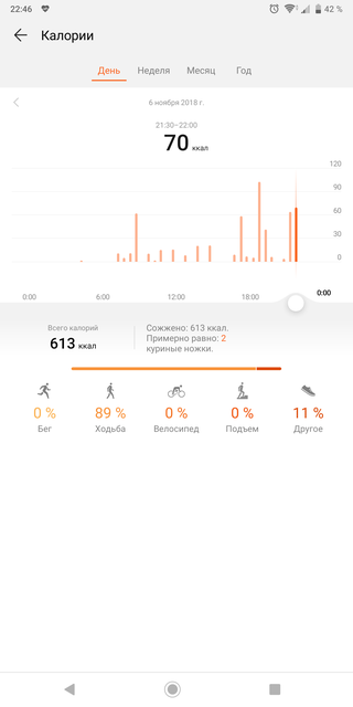 Горизонтальными движениями по экрану переключаются виджеты, если так можно выразиться. Их три: диаграммы активности с тремя показателями. Количество шагов за день, время активности и сколько раз пользователь встал из-за рабочего стола. Далее — экран с текущим пульсом, максимальным, средним, минимальным значением за день и диаграммой его изменения. И последний виджет — погода.