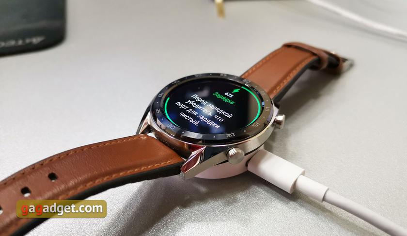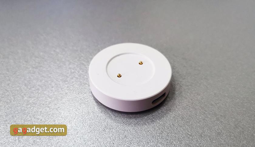 Магнитное зарядное устройство представляет из себя небольшую белую "шайбу" с двумя контактами и разъёмом USB Type-C сбоку. Часы заряжаются приблизительно полтора часа от фирменного быстрого ЗУ для смартфонов Huawei (я использовал от Huawei P20):