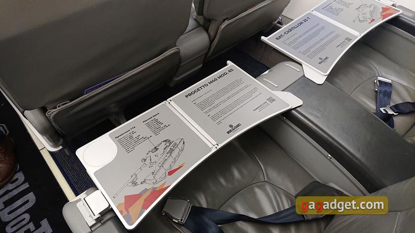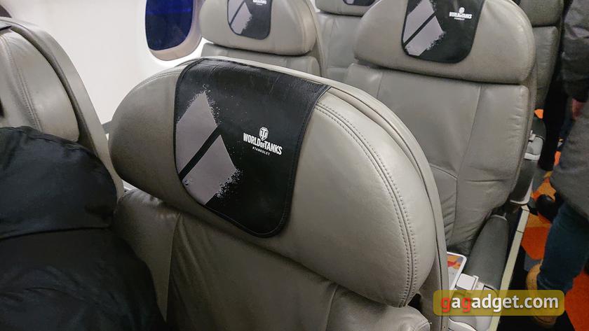 Внутри самолёта на каждом столике напечатана историческая справка о каком-нибудь танке или самоходной установке. Самолёт рассчитан на 107 пассажиров и все 107 столиков содержат информацию о разных моделях. Все подголовники и дорожки также стилизованы под игровую тематику World of Tanks, а также разработано новое, соответствующее звуковое обращение от имени экипажа и бортпроводников со внутриигровой терминологией, которое будет транслироваться во время перелётов.