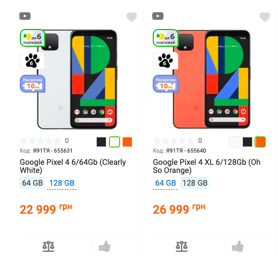 За Pixel 4 просят 22 999 гривен (64 ГБ) и 24 999 гривен (128 ГБ), за Pixel 4 XL — 24 999 и 26 999 гривен соответственно. В США смартфоны обойдутся в $799/899 и $899/999, то есть на $100–200 дешевле.