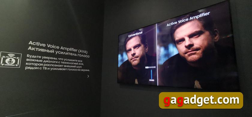 Телевизор во время работы постоянно анализирует (надо полагать, с помощью микрофонов, используемых для голосовых команд) окружающее звучание и при появлении шума (включенный пылесос или сосед с перфоратором) автоматически повышает громкость звука в речи так, чтобы компенсировать внешние шумы. Выглядит интересно, на практике проверить работу этой функции на стенде у меня не сильно получилось — мощность ручного пылесоса там была невысокой, а перфоратора под рукой не было.