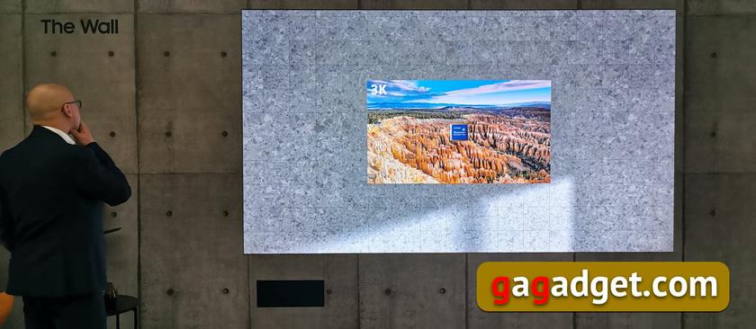 Информации об этих телевизорах немного — каждый продается индивидуально, это настоящий B2B-сегмент больших проекционных панелей, которые мы видим чаще всего на концертах. Технология MicroLED интересна тем, что каждый пиксель светится и управляется отдельно, еще у этой технологии фантастические показатели по яркости и контрастности при низком энергопотреблении. А еще обратите внимание на реально безрамочный экран. Такой телевизор реально может занять всю стену, если у заказчика будет соответствующие желание и деньги.