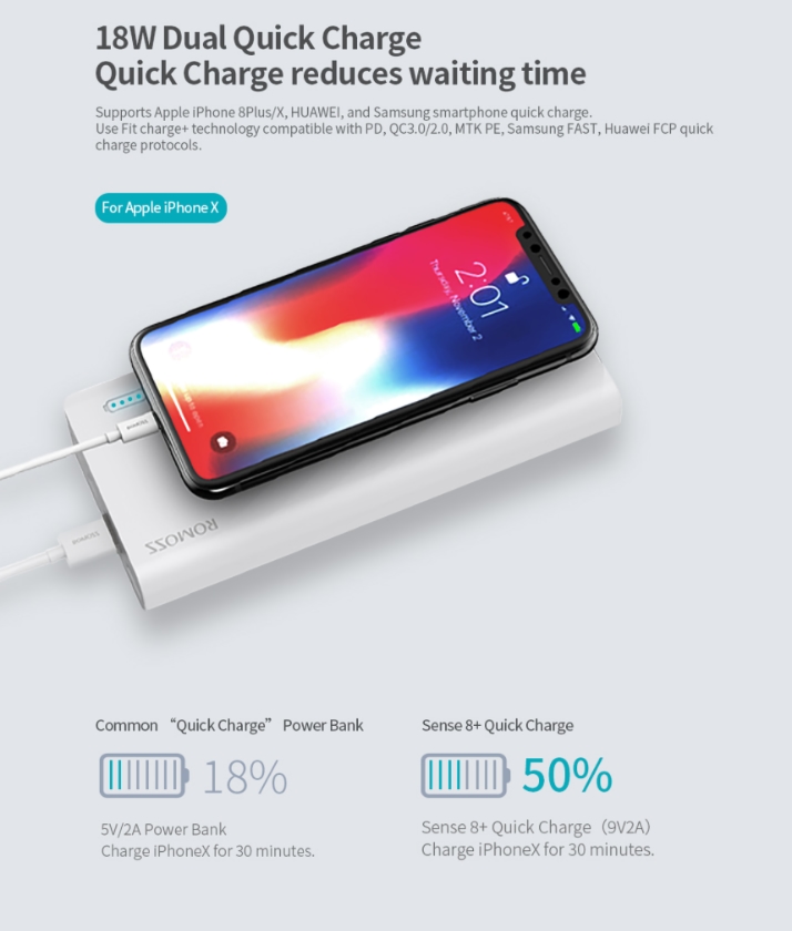 Устройство может похвастаться объёмом на 30 000 мАч, защитой от перегревов и скачков напряжения, а также наличием быстрой 18-ваттной зарядки на вход и выход. Кстати, она способна зарядить iPhone X на 50% всего за 30 минут.