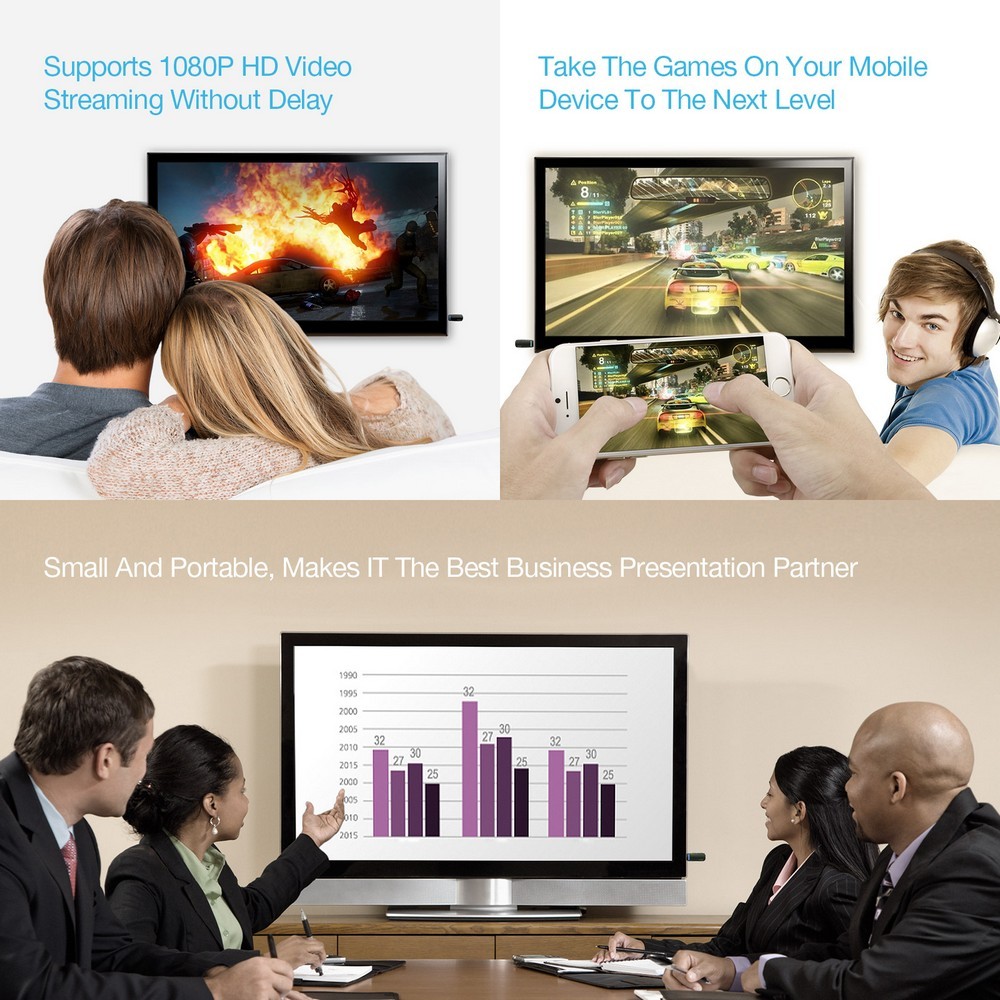 Устройство выглядит как флешка и имеет разъём HDMI для подключения к телевизору. Гаджет поддерживает двухдиапазонный Wi-Fi (2.4 ГГц и 5 ГГц), а также технологии Airplay, MiraCast, DLNA для трансляции изображений, аудио и видеофайлов (максимальное разрешением 1080p) с компьютера или смартфона. Работает адаптер на процессоре MIPS с частотой 600 мГц и имеет 128 МБ оперативной памяти типа DDR3. Весит устройство всего 20 г.