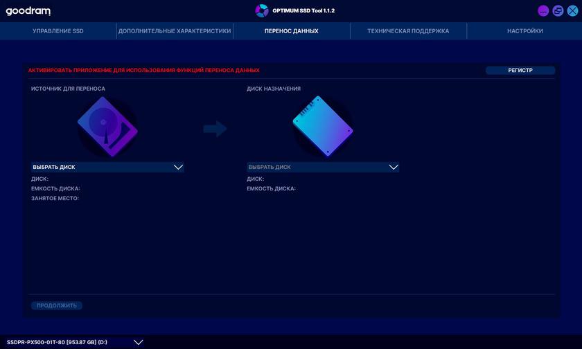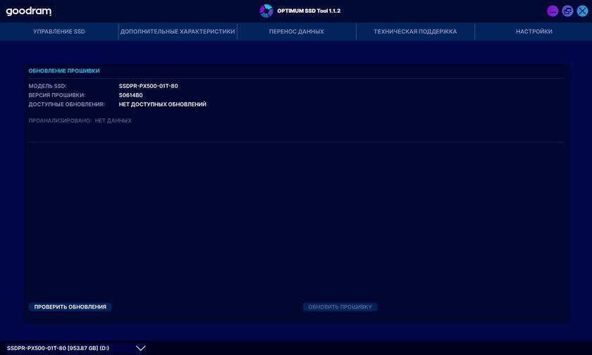 У Goodram есть фирменное приложение OPTIMUM SSD Tool для работы со своими SSD-накопителями. Функционально есть всё самое необходимое: общий мониторинг накопителя, его заполнения (включая сортировку по типам данных), возможность обновления прошивки, тест скорости, общее время работы, оставшийся ресурс, возможность переноса данных и обратная связь с разработчиками: