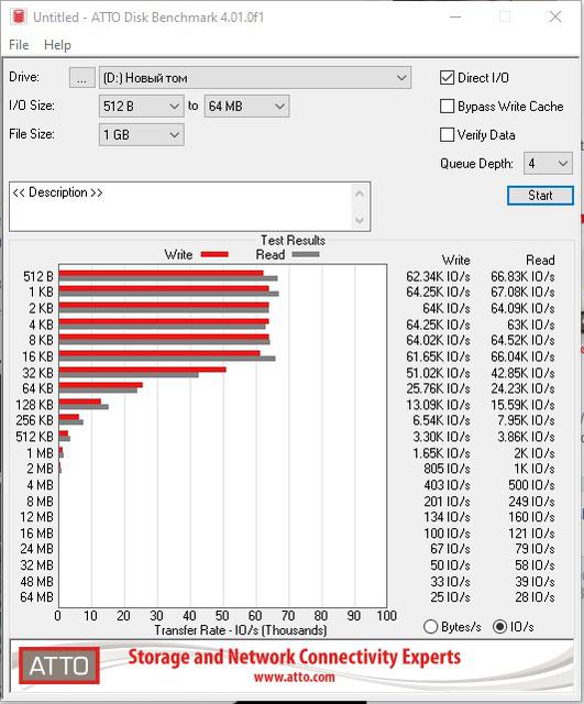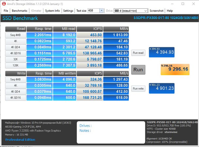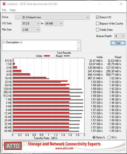 Вместо кэша DRAM контроллер использует технологию HMB (Host Memory Buffer): за кэширование отвечают процессор ПК и оперативная память. Такое решение позволяет уменьшить стоимость контроллера (и, соответственно, накопителя). Также используется SLC-кэширование, при котором часть емкости накопителя используется в режиме SLC для записи и SSD будет демонстрировать максимальную скорость. После заполнения кэша, скорость записи будет существенно падать. Такое решение сейчас активно используется в скоростных SSD, только размер того самого SLC-кэша существенно отличается. Производитель обещает скорость чтения до 2050 МБ/с и скорость записи до 1650 МБ/с, количество произвольных операций чтения и записи файлов 4KB до 171 000 IOPS и до 143 000 IOPS соответственно, они указаны на базе тестов Crystal Disk Mark. В качестве тестового стенда использовался стационарный ПК, конфигурацию которого можно посмотреть в нашей статье. Как показали синтетические тесты, накопитель по большей части демонстрирует заявленные показатели. CrystalDiskMark показал максимальную скорость чтения чуть меньше 2100 МБ/с, а записи — около 1680 МБ/с. В ATTO Disk Benchmark максимальная скорость чтения достигла 1960 МБ/с, а записи — 1610 МБ/с.