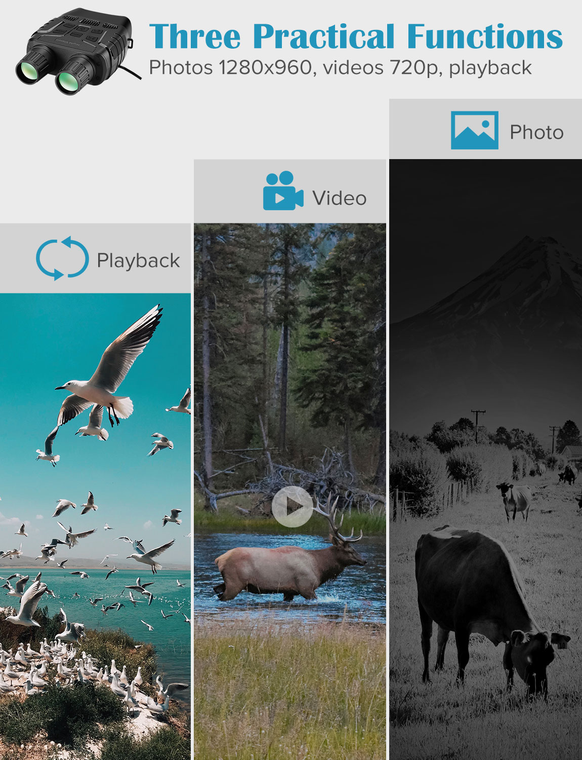 Он оснащён TFT-дисплеем с диагональю 2.31 дюйма и умеет записывать видео с HD-разрешением, а также делать фотографии. Прибор имеет специальный ИК-датчик, который работает ночью на расстоянии до 274 метров. Также гаджет может похвастаться 4-кратным оптическим приближением картинки и поддержкой карты-памяти до 32 ГБ. Питается устройство от шести пальчиковых батареек. К сожалению, в комплекте они не идут. Их придётся докупать отдельно. Автономности должно хватить на 6-8 часов записи видео.