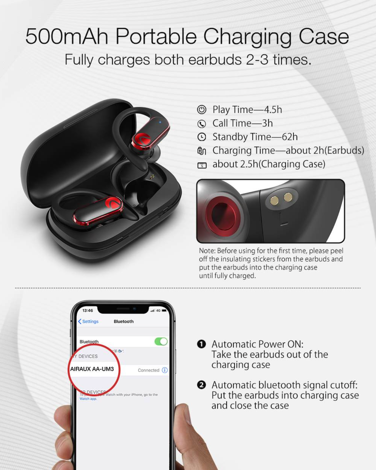Модель называется AIRAUX AA-UM3. Её производитель позиционирует, как спортивную гарнитуру. Новинка имеет защиту от воды IPX5, Hi-Fi звучание, модуль Bluetooth 5.0 с радиусом действия до 10 метров и скоростью передачи звука 3 Мб/с, а также кейс с аккумулятором на 500 мАч. С помощью него можно полностью зарядить наушники 2-3 раза. Кстати, одного заряда, по словам компании, хватит до 4.5 часов прослушивания музыки.