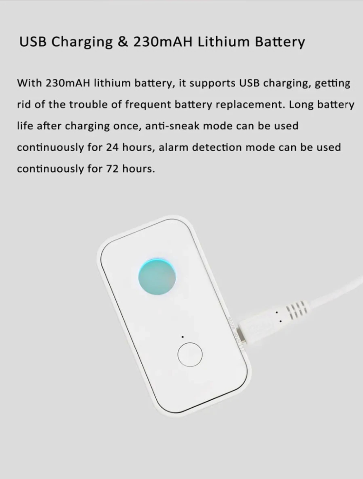 Питается Xiaomi Smoovie от аккумулятора на 230 мАч. В режиме детектора шпионских камер он проработает 72 часа, а как анти-вор — 24 часа.