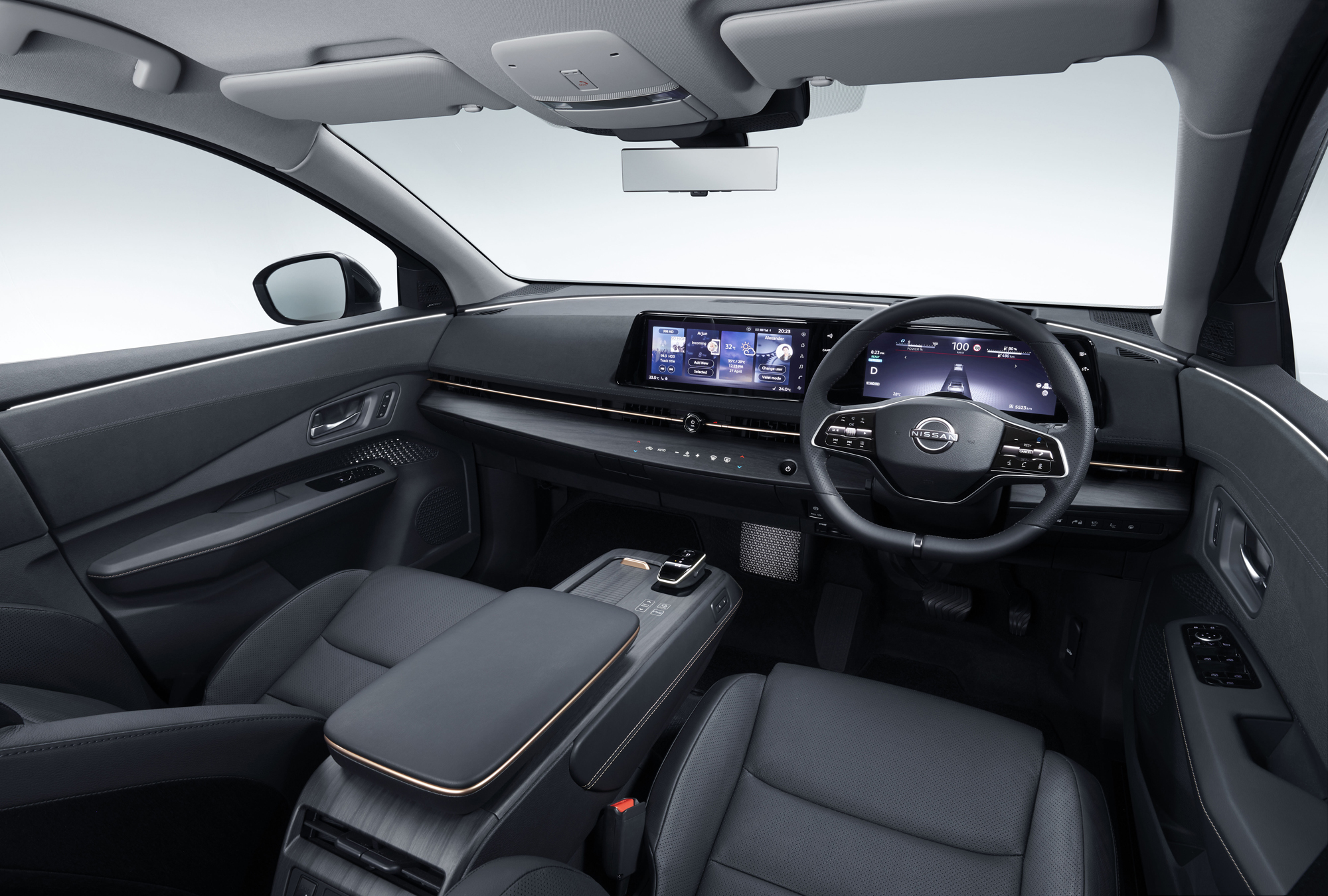 Из интересного, в Nissan Ariya ещё стоит отметить новый автопилот ProPILOT, голосовой помощник, который запускается фразой Hey Nissan, бесключевой доступ, пульт с дистанционным управлением, а также приборную панель с двумя экранами на 12.3 дюйма и цветной проекционный дисплей.