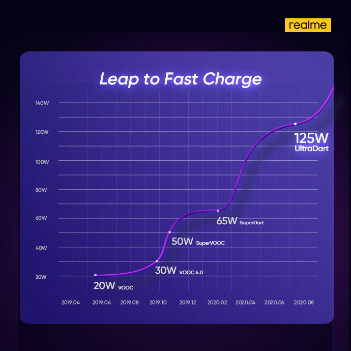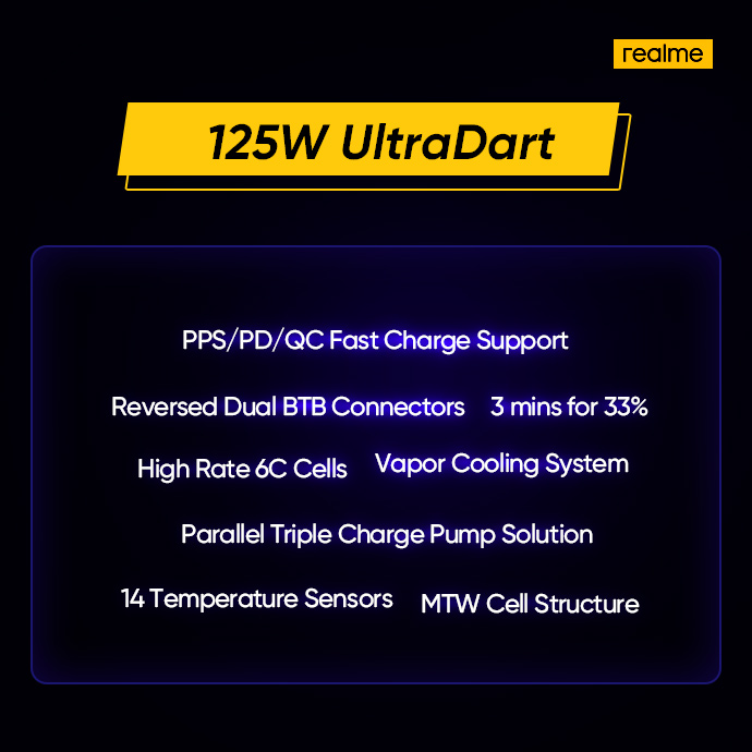 realme 125W ULTRADART fast charging tech announced in China. 3mins charge will fill up the 4000mAh up to 33% !#realme #ULTRADART pic.twitter.com/ACuWRK7i67