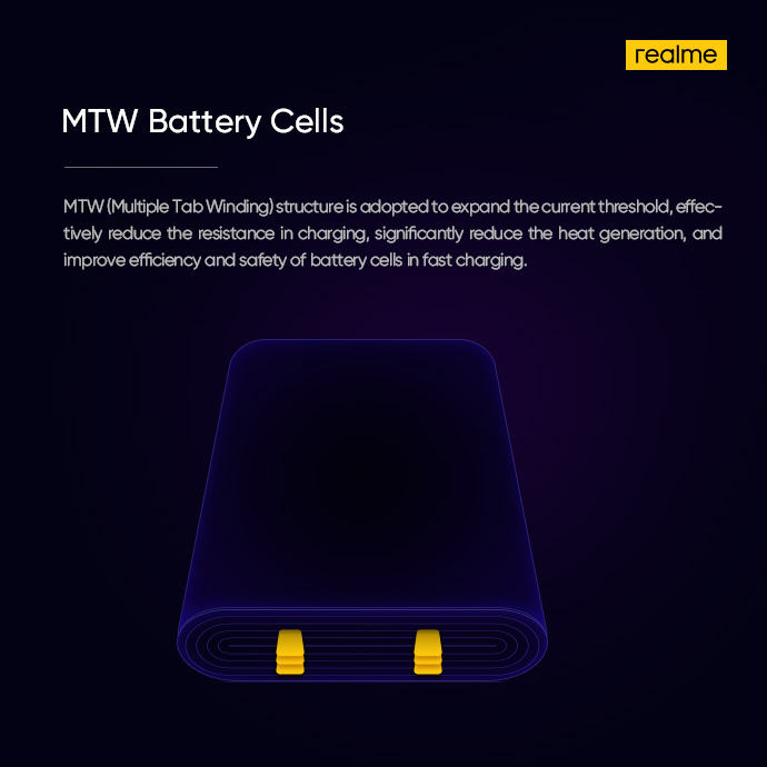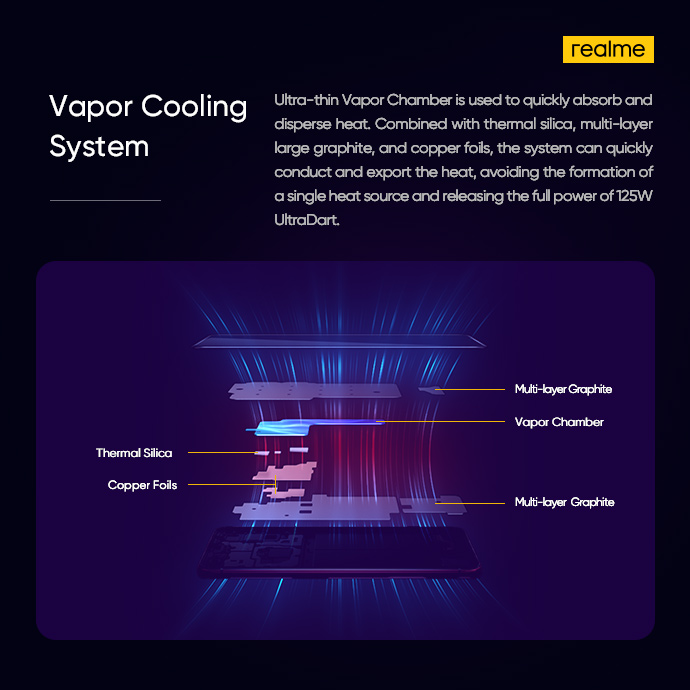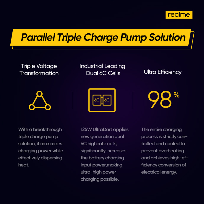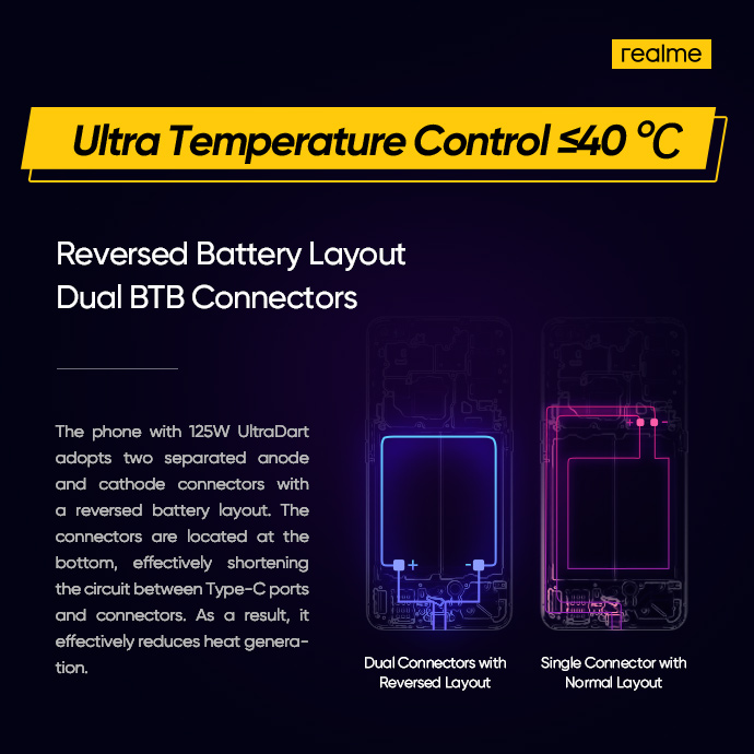 Технологию назвали UltraDart Fast Charging. Она способна зарядить аккумулятор на 4000 мАч на 33% за 3 минуты. Система использует структуру с перевёрнутой микросхемой, которая сокращает путь тока до порта USB Type-C и уменьшает источник тепла. Она также имеет ультратонкую пластину с паровым охлаждением, которая может похвастаться высокой энергоэффективностью и теплопроводностью. Это быстро поглощает и рассеивает тепловую энергию во время процесса.