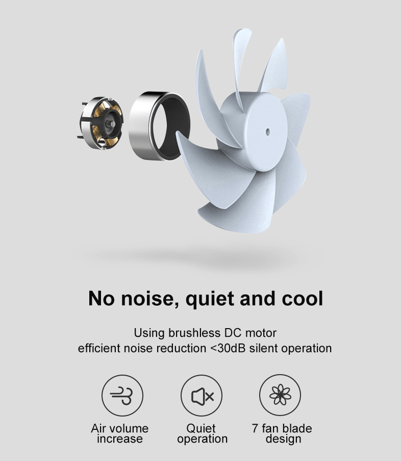 Устройство сделано из пластика/силикона и весит всего 195 грамм. Его можно сгибать в разные стороны, а также разобрать на две части. Вентилятор оснащён 7 лопастями, которые по словам производителя, работают бесшумно (показатель шума меньше 30 дБ).