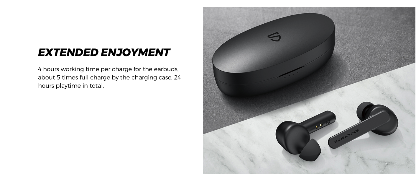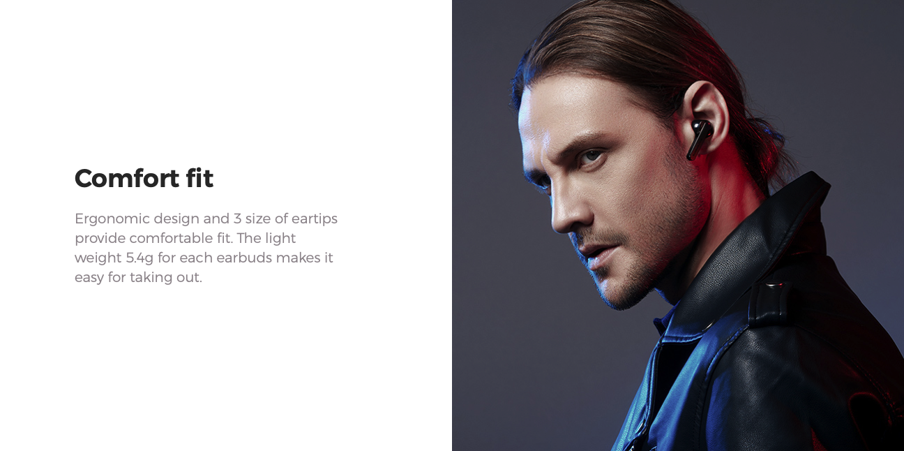 Модель имеет минималистичный дизайн, Bluetooth 5.0 c функцией быстрого подключения и радиусом действия до 10 метров, защиту IPX5 и аккумулятор на 45 мАч (в каждом наушнике). По словам производителя такого объёма хватит на 4 часа прослушивания музыки. В зарядном кейсе, в свою очередь, установлена батарея на 650 мАч. Она продлит автономность до 24 часов.