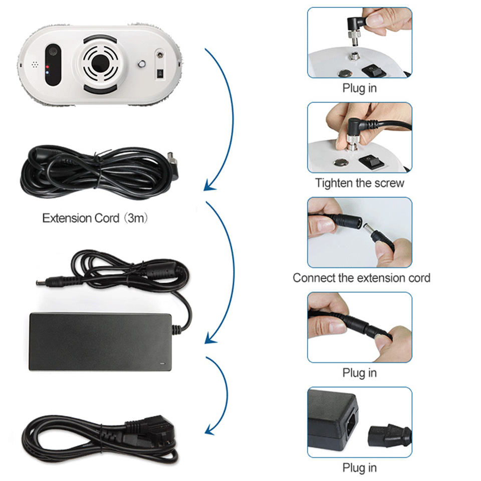 Робот весит чуть меньше 5 кг и имеет две круглые тряпки для мытья. Работает он от сети, но в случае сбоя питания продолжает крепиться к поверхности и не падает. Если вы моете окна на большой высоте — лучше использовать страховочный трос, который идет в комплекте.