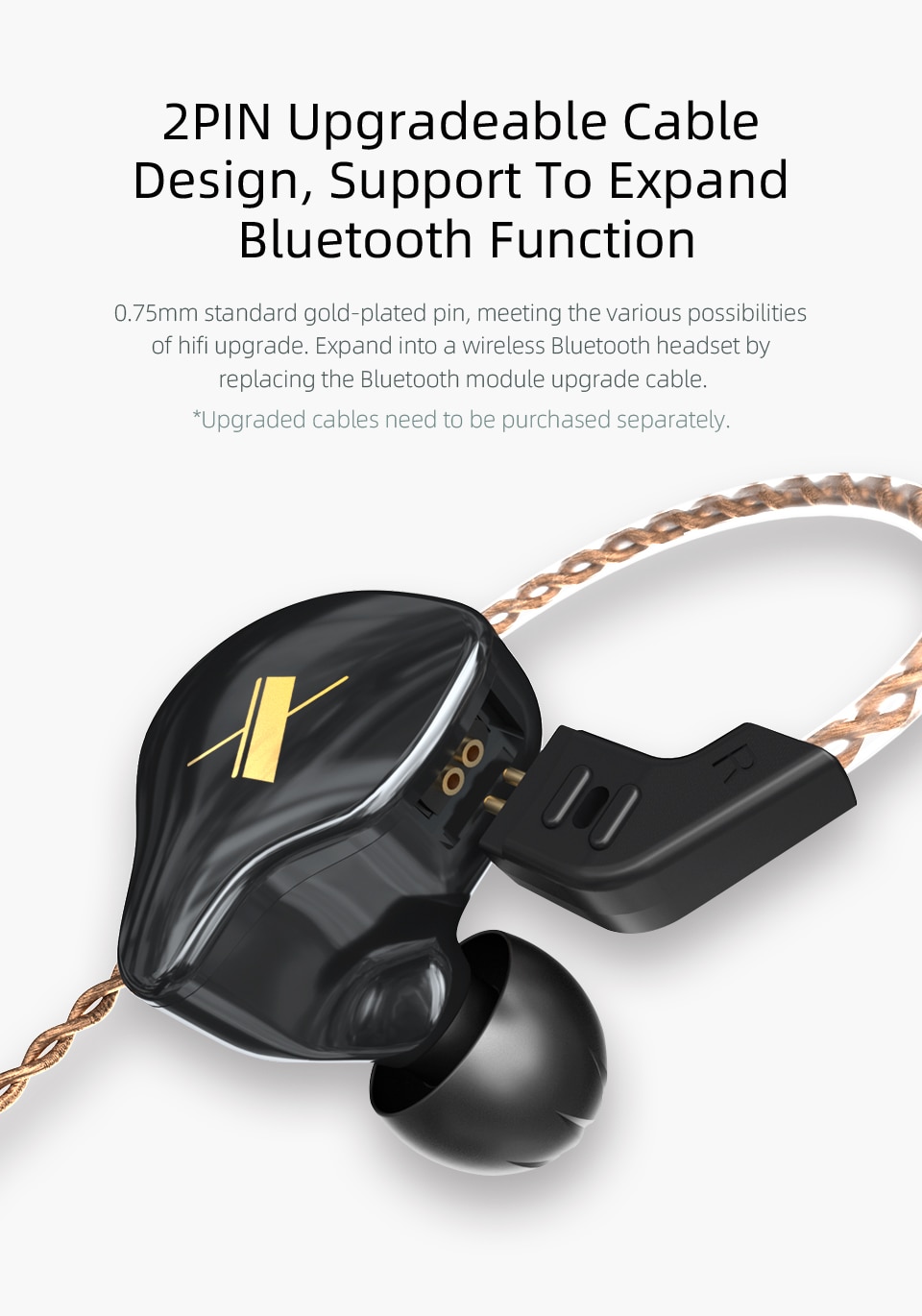 Модель называется KZ EDX. Она может похвастаться 10-миллиметровыми драйверами, диапазоном частот от 10 до 20000 Гц, Hi-Fi-звучанием, а также 1.25-метровым кабелем, который отсоединяется от наушников. То есть если он порвётся — его можно будет без проблем заменить. Поставляются KZ EDX с блоком управления и микрофоном. Есть также версия без него.