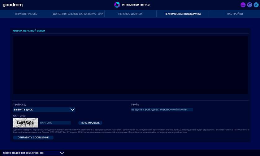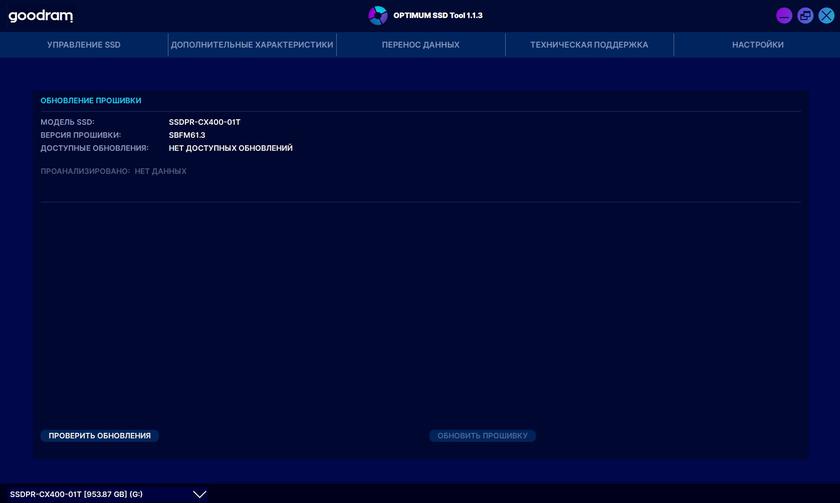 Фирменное приложение Goodram OPTIMUM SSD Tool мы уже рассматривали в предыдущих обзорах накопителей Goodram. Его функциональность не изменилась: есть возможность обновления прошивки, утилита для переноса данных с другого накопителя, тест скорости, мониторинг состояния SSD и встроенная форма обратной связи.