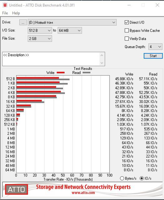 - Максимальная скорость чтения составляет 550 МБ/с, она стабильна. Максимальная скорость записи — 490 МБ/с, но при линейной записи быстро падает до 100 МБ/с после заполнения SLC-кэша.