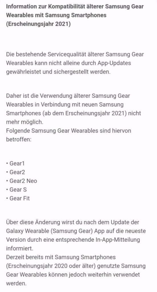 Так, пользователи из Германии начали получать в приложении Galaxy Wearable уведомление о том, что новые смартфоны Galaxy 2021 года выпуска не будут работать со старыми устройствами Galaxy Gear, которые вышли в период с 2013 по 2014 год.