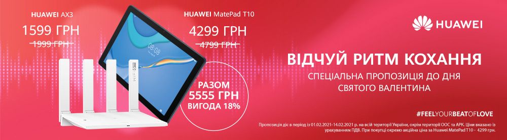 Wi-Fi AX3Dual-core WS7100 — 1 999 1 599 грн (с 1 по 14 февраля) - Huawei MediaPad Т3 10 LTE 2/16 ГБ Gray (+чехол) — 4 799 4 499 грн (с 1 по 14 февраля)
