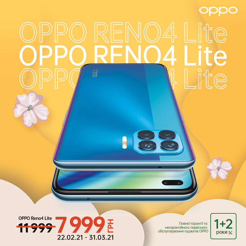 - OPPO Reno 4 Lite — 7999 грн (было 11 999), акция действует с 22.02.21 по 31.03.21