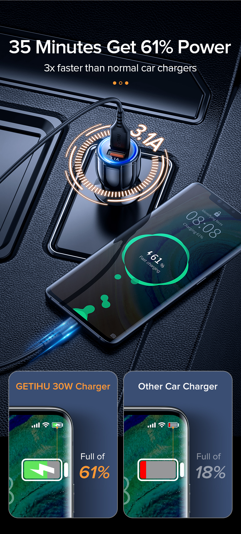 GETIHU 30W: автомобильная зарядка с Power Delivery, LED-индикатором и двумя USB-портами дешевле $4