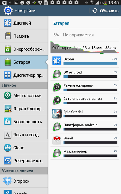 За работу и производительность отвечает двухъядерный процессор Exynos частотой 1.5 гигагерца, вместе с графикой Mali-400 MP. Им в помощь — полтора гигабайта оперативной памяти и 16-гигабайтный накопитель. Это не так уж много, но поскольку есть слот для microSD, проблемы я не вижу. Начинка средняя, особенно для устройства с таким большим экраном, но ее вполне хватает для просмотра фильмов в FullHD-разрешении и на 3D-игры. Мне довелось поиграть на нем в Real Racing 3 и Dead Trigger. Планшет не тормозил, играть на нем приятно и комфортно: большой экран при легком корпусе создают неплохую базу для игр с датчиком движения. Интерфейс Android 4.2 Jellybean, TouchWiz работал плавно, но при забитой памяти в тестовых режимах случались редкие притормаживания.