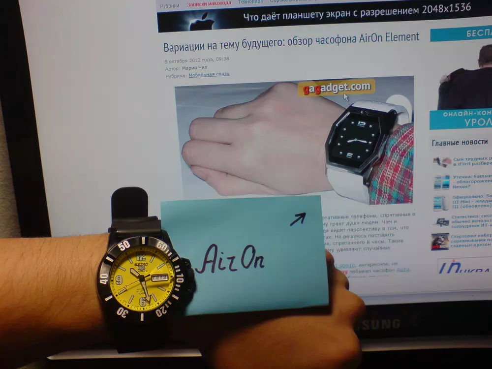 Вы можете выиграть этот часофон, если проживаете в Украине и примете участие в нашем конкурсе. Условия, как обычно, очень просты — нужно загрузить (используя кнопку ниже) фотографию своих наручных часов с нарисованным от руки текстом «AirOn» в кадре. Например, так, как это показано на фото ниже. Конкурс продлится с 8 по 21 октября (включительно), победитель будет выбран в результате честной жеребьевки. В конкурсе, традиционно, не могут принимать участие сотрудники компании «Магнет» и их родственники. От одного участника принимается только одно фото.