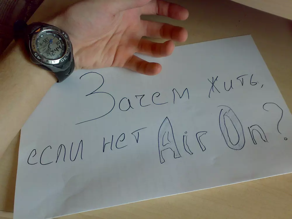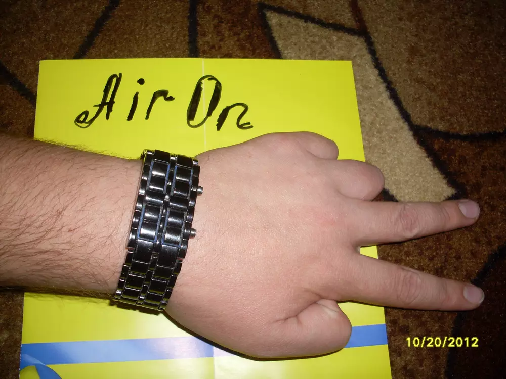 Вы можете выиграть этот часофон, если проживаете в Украине и примете участие в нашем конкурсе. Условия, как обычно, очень просты — нужно загрузить (используя кнопку ниже) фотографию своих наручных часов с нарисованным от руки текстом «AirOn» в кадре. Например, так, как это показано на фото ниже. Конкурс продлится с 8 по 21 октября (включительно), победитель будет выбран в результате честной жеребьевки. В конкурсе, традиционно, не могут принимать участие сотрудники компании «Магнет» и их родственники. От одного участника принимается только одно фото.